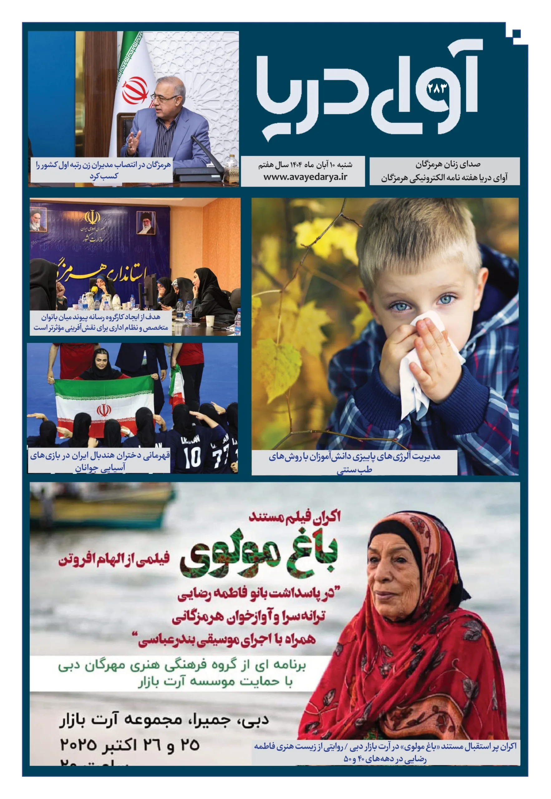 مستند «باغ مولوی» به کارگردانی الهام افروتن، عکاس و مستندساز هرمزگانی، طی روزهای سوم و چهارم آبانماه (۲۵ و ۲۶ اکتبر ۲۰۲۵) در مجموعه فرهنگی ـ هنری «آرت بازار دبی» با حضور کارگردان اثر به نمایش درآمد و با استقبال چشمگیر مخاطبان ایرانی و اماراتی روبهرو شد. در این دو شب اکران، بیش از ۲۰۰ […] هرمزگان در انتصاب مدیران زن رتبه اول کشور را کسب کرد