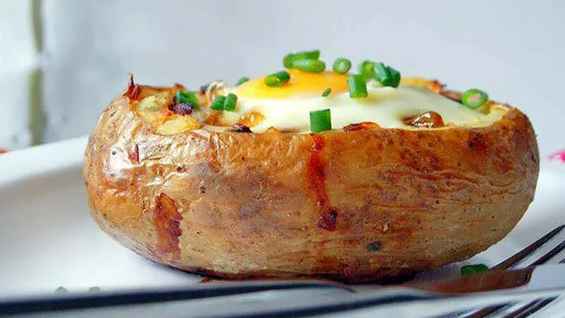با استفاده از یک قاشق کوچک (مانند قاشق چای‌خوری) یا ابزار مخصوص گود کردن سیب‌زمینی، مغز سیب‌زمینی‌ها را به آرامی و با احتیاط خارج کنید تا دیواره‌ها و کف سیب‌زمینی سالم و به اندازه کافی ضخیم باقی بماند و در حین پخت پاره نشود. (می‌توانید قسمت‌های خارج شده را برای تهیه پوره سیب‌زمینی یا کوکو استفاده کنید.)