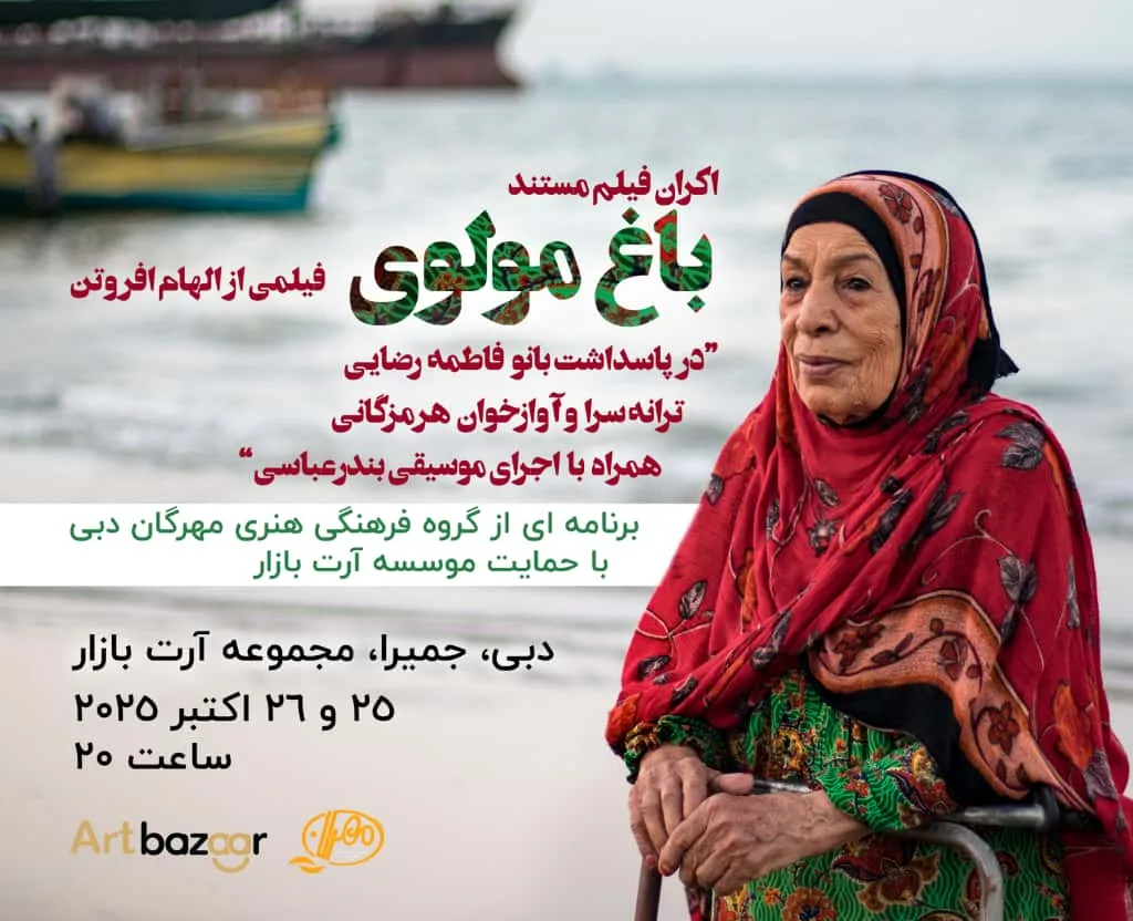 مستند «باغ مولوی» به کارگردانی الهام افروتن، عکاس و مستندساز هرمزگانی، طی روزهای سوم و چهارم آبانماه (۲۵ و ۲۶ اکتبر ۲۰۲۵) در مجموعه فرهنگی ـ هنری «آرت بازار دبی» با حضور کارگردان اثر به نمایش درآمد و با استقبال چشمگیر مخاطبان ایرانی و اماراتی روبهرو شد.